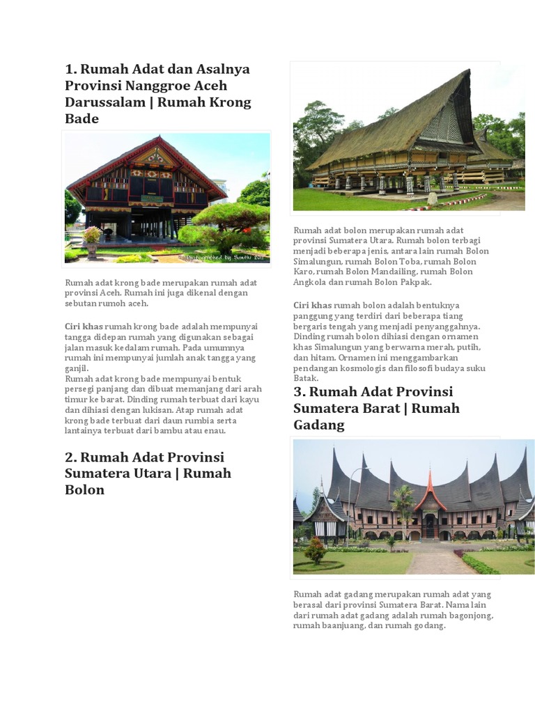Rumah Adat Gadang Provinsi Sumatera Barat Rumah Gadang Godang adalah rumah adat etnik Minangkabau yang sampai kini masih banyak ditemui di provinsi Sumatera BaratRumah Gadang ini bentuknya sama seperti rumah etnik Melayu pada umumnya sehingga tidak heran jika rumah adat ini juga bisa kita temui di provinsi dan negara lain yang berpenduduk suku. Bentuk bangunan Rumah Adat Kajang Lengko dibuat dengan konstruksi rumah panggung yang membuatnya memiliki kemiripan dengan kebanyakan rumah adat yang berasal dari beberapa. Bentuknya juga unik dibuat panggung dengan atap yang hampir memenuhi bagian bawah.